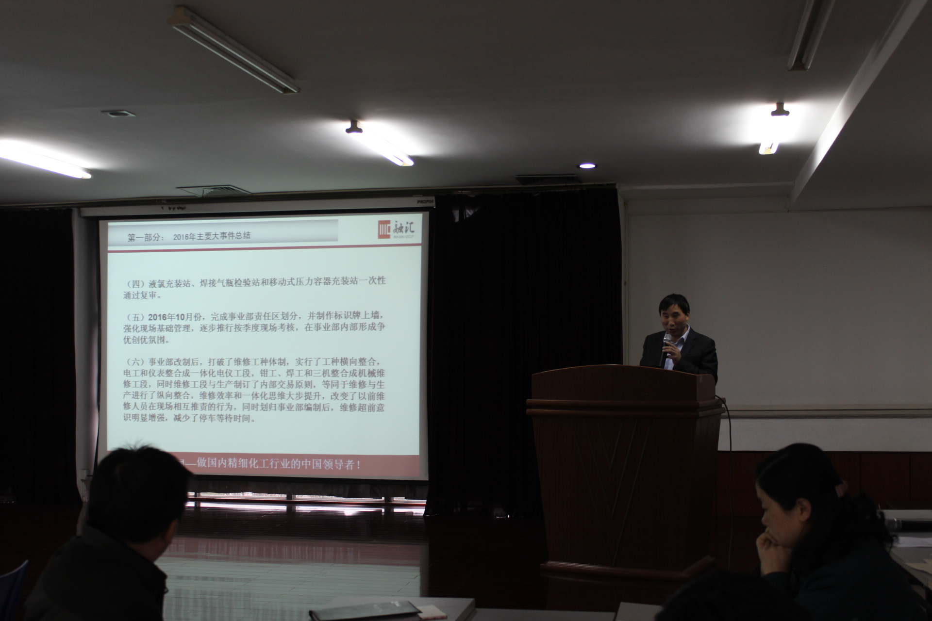 總結(jié)表彰大會(huì)上,首先由各工段長對(duì)于2016年的工作進(jìn)行總結(jié),各工段長用一個(gè)又一個(gè)詳實(shí)的數(shù)據(jù)展現(xiàn)了成績、說明了不足,于數(shù)字中反映出了認(rèn)真與深刻的工作作風(fēng)??偨Y(jié)階段最后由鄭春光總經(jīng)理對(duì)2016年的事業(yè)部取得的成績給出了詳細(xì)的闡述,并對(duì)2017年的八大重點(diǎn)工作進(jìn)行布署與規(guī)劃。會(huì)議第二議程用PPT進(jìn)行2017年元月氯堿事業(yè)部現(xiàn)場管理考評(píng)展示,用圖片進(jìn)行了優(yōu)劣的對(duì)比,借此督促提升事業(yè)部的現(xiàn)場管理。會(huì)議的重點(diǎn)是進(jìn)行表彰,受表彰的人員和集體是經(jīng)過事業(yè)部內(nèi)部的集體討論評(píng)選出來的,他們分別為優(yōu)秀員工:李晉強(qiáng)、龔思美、吳大林、于葛、陳華、程燕華、尚昌軍、梁林、陳勇;優(yōu)秀經(jīng)營長:吳孝飛、張龍才、董寶生;優(yōu)秀班組:十萬噸董寶生班組、五萬噸唐述貴班組、二萬噸范文班組、鹽水雷偉班組、分析黃琪璐班組,事業(yè)部也對(duì)他們的付出給予了獎(jiǎng)勵(lì),希望他們再接再厲,2017年再創(chuàng)佳績。事業(yè)部總經(jīng)理鄭春光總結(jié):要求大家做一個(gè)內(nèi)心充滿富足,有責(zé)任擔(dān)當(dāng),并能點(diǎn)燃他人希望的人。最后人力資源發(fā)展中心副總監(jiān)張衛(wèi)衛(wèi)代表公司對(duì)事業(yè)部取得的成績進(jìn)行勉勵(lì):公司繼續(xù)發(fā)展需要人才,機(jī)會(huì)是留給時(shí)刻準(zhǔn)備好的人。并與大家分享了科大EE中心吳林主任新年寄語。
