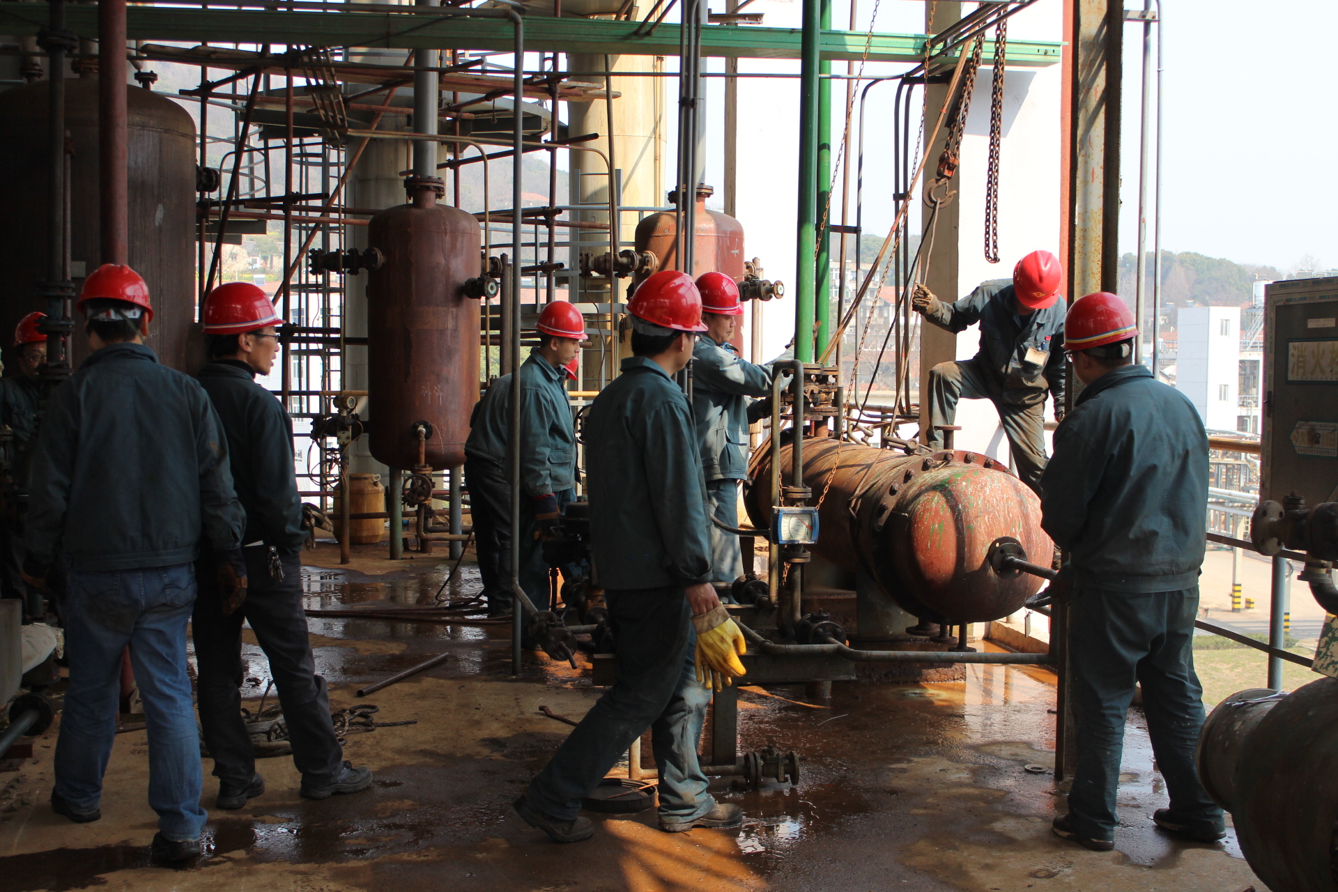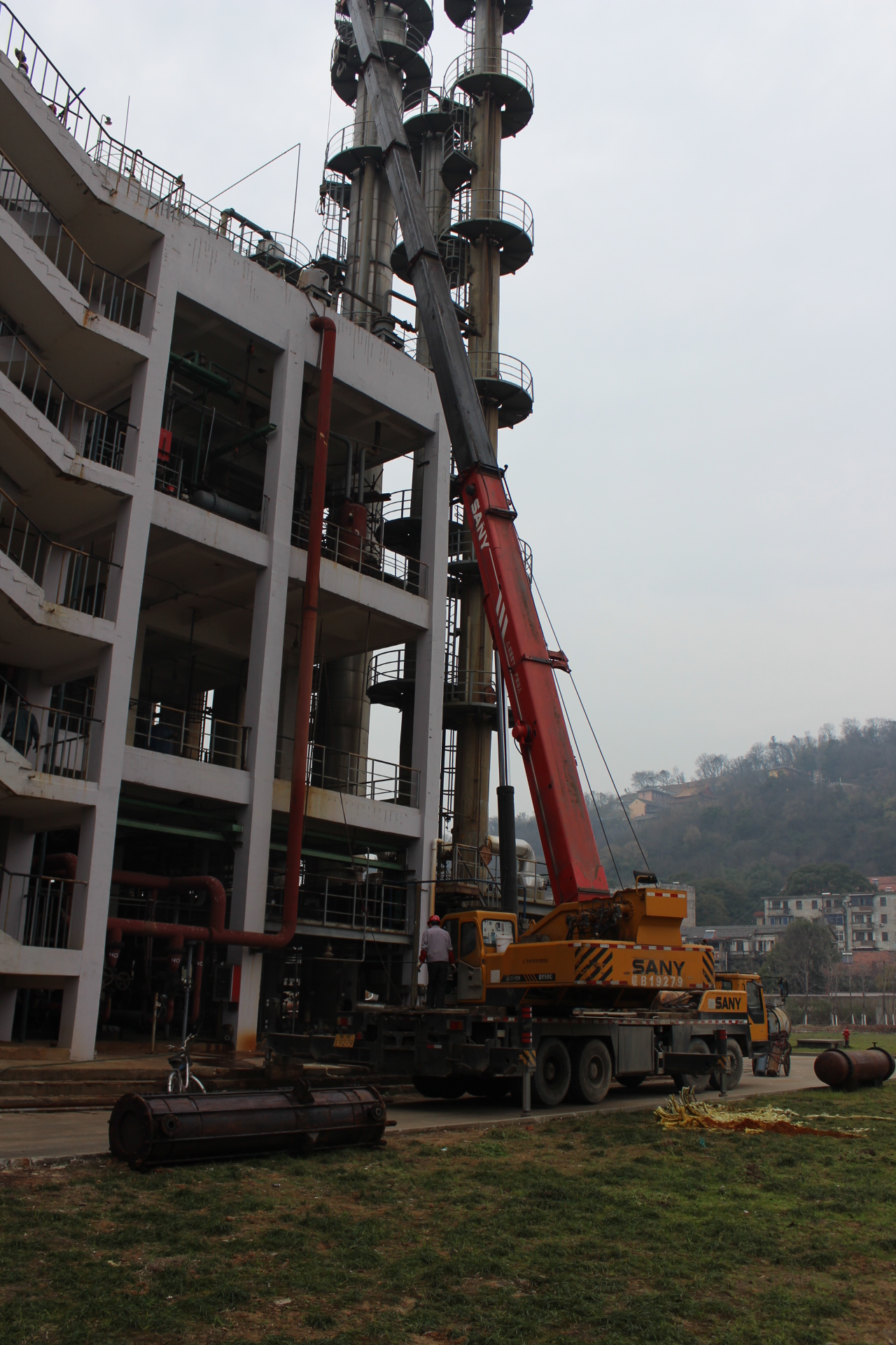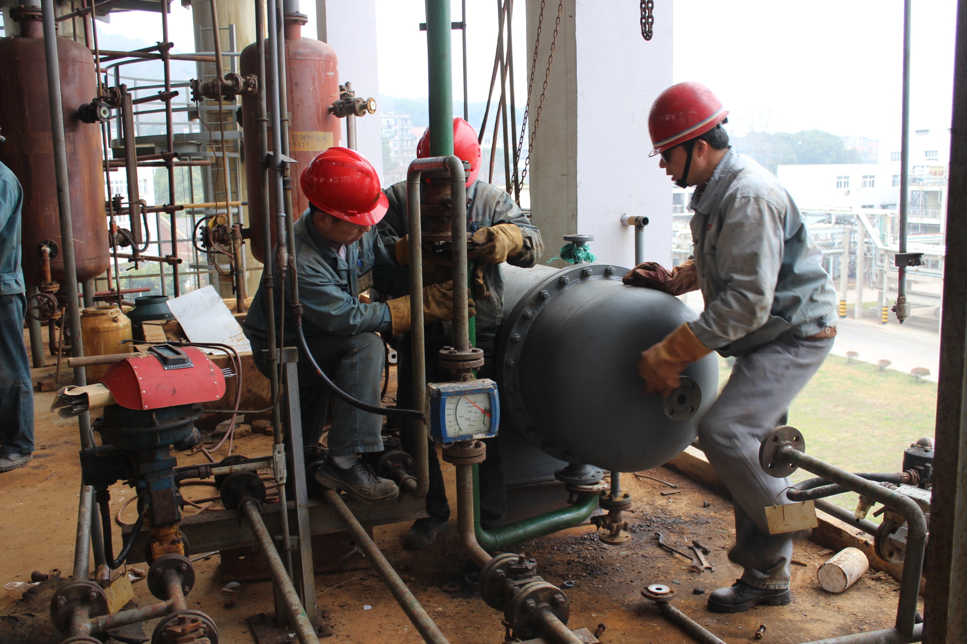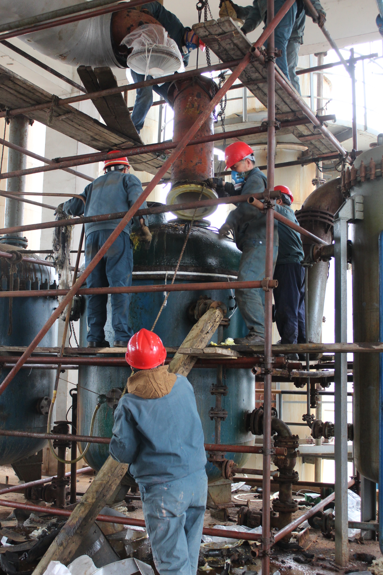 全廠總動員,務必保障精餾檢修工作安全高效進行,各司其職,各負其責,“上面那個,把安全帽戴好,不要松松垮垮的”,安全主管薛敏不停地叮囑站在腳手架上拆卸螺栓的員工。設備廠長劉文文帶著他的得意小徒弟李青松,在導熱油爐外與廠家確認爐子情況,設備主管王友寶,協(xié)調著吊機完成各處設備吊裝。工藝主管秦濤緊盯著新項目的除霧器檢查。還有我們的廠長俞捷、廠助丁允波,不管現(xiàn)場是多糟糕的環(huán)境,始終能夠看到他們的身影,仔細查看每一處待檢修項目的安全工作,同時還對檢修中需要改進的地方及時提出建議和意見,對檢修中的安全、進度和質量進行嚴格把關。