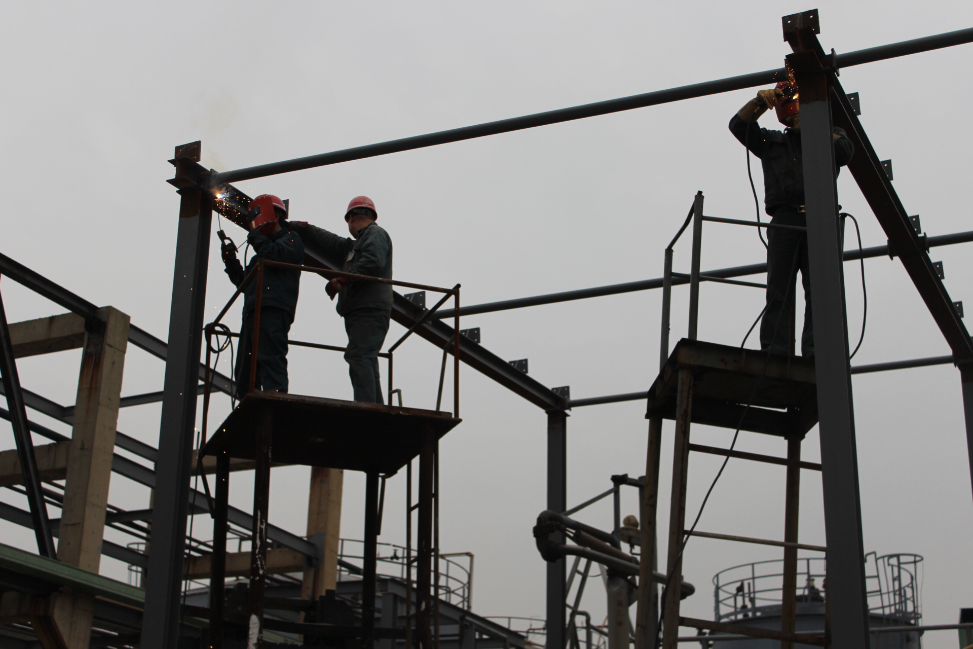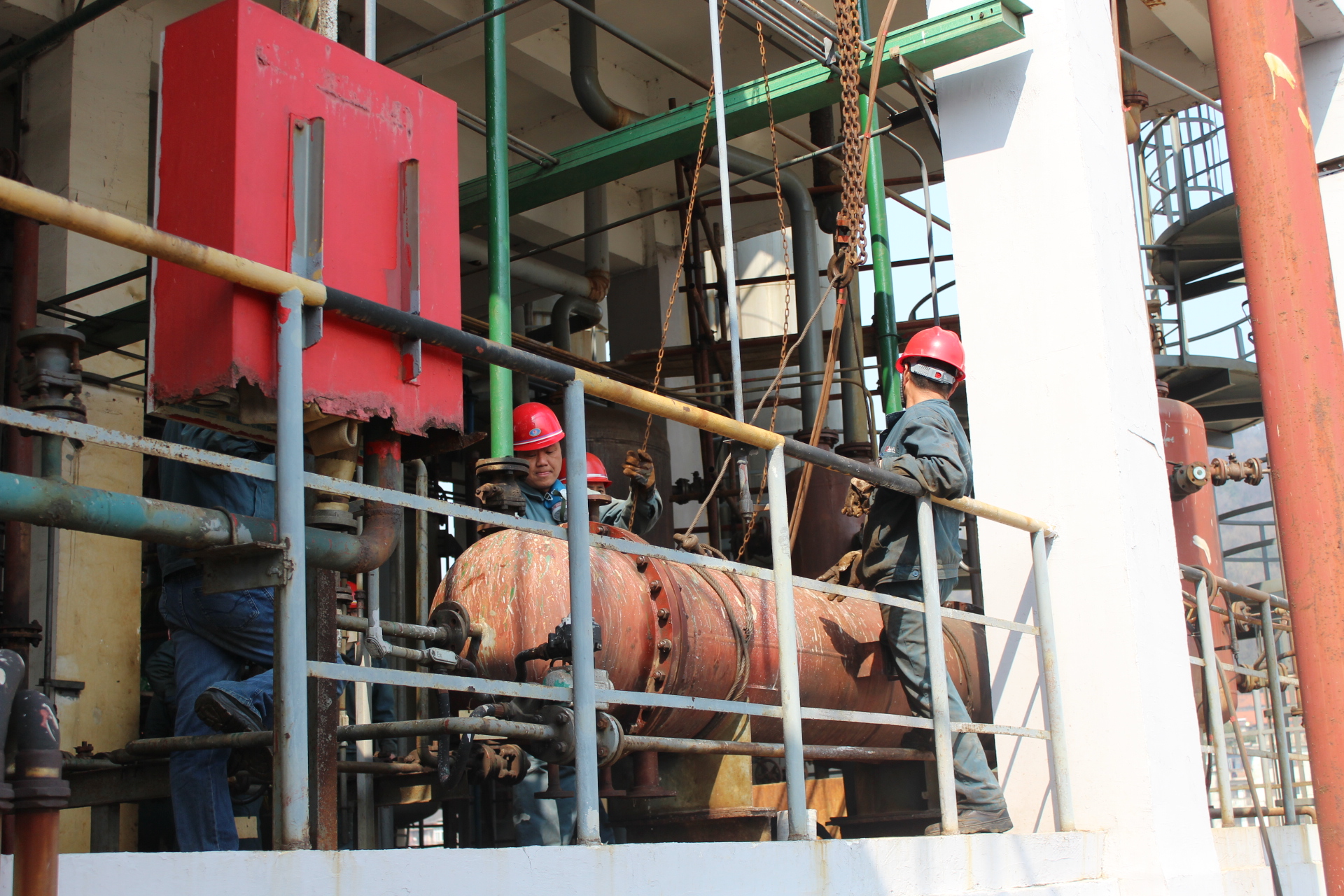 第一天需要更換兩處設備,吊機進不來三樓平臺,起重宛師傅想方設法巧妙將四烯冷卻器吊出,又在維修人員齊心協(xié)力下將新設備復位,此時眾人均松了一口氣,但新的問題又出現(xiàn)了:舊設備基座與新設備不符,難倒了一眾維修人,此時二部焊工工段長佘全紅站出來說:“這個好辦,拿新的工字鋼,割了重新焊!”,一并人立即行動,量好了尺寸,叫人拉上車子就往倉庫奔去。不出一小時新的支架便做好了。