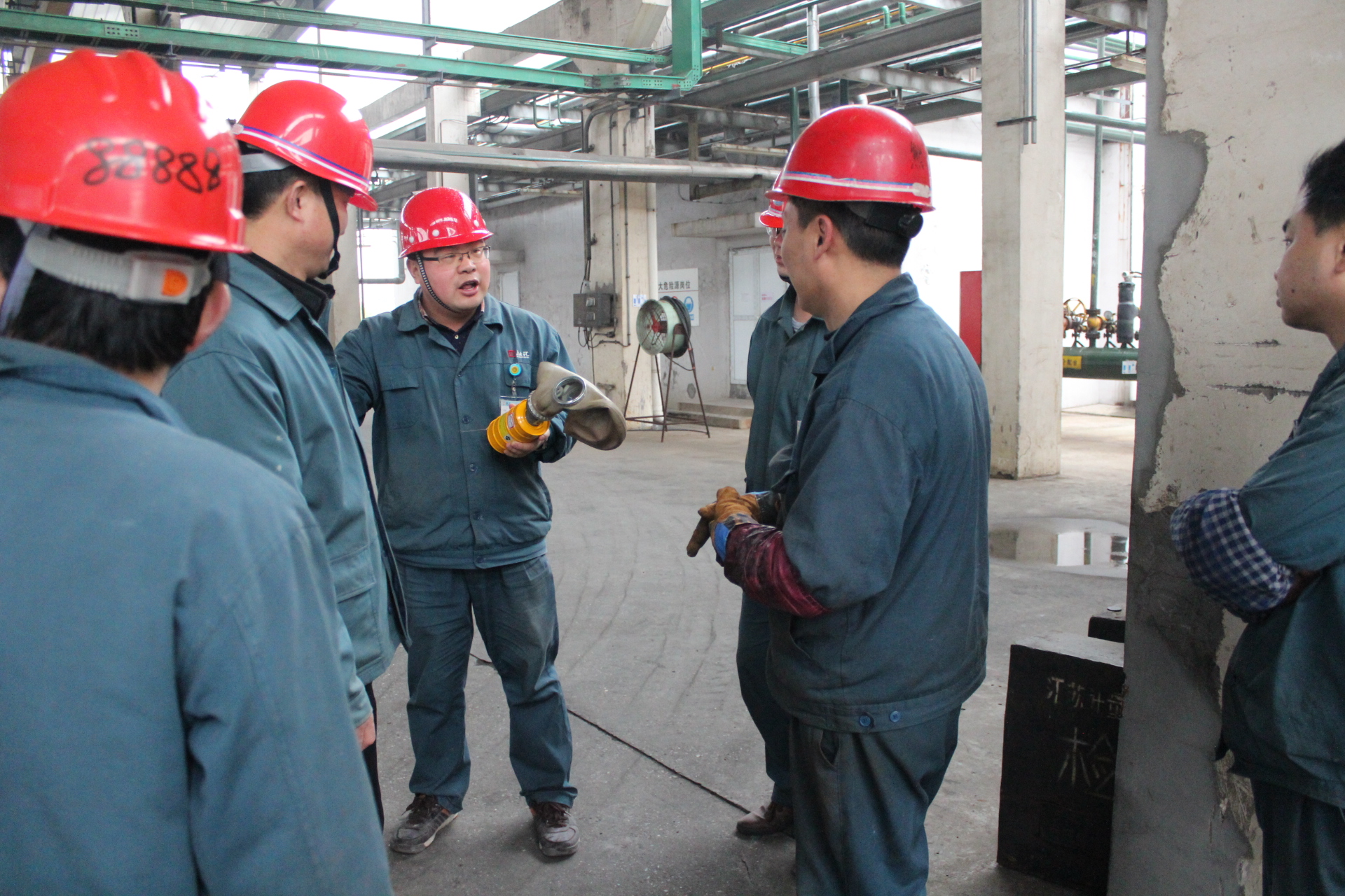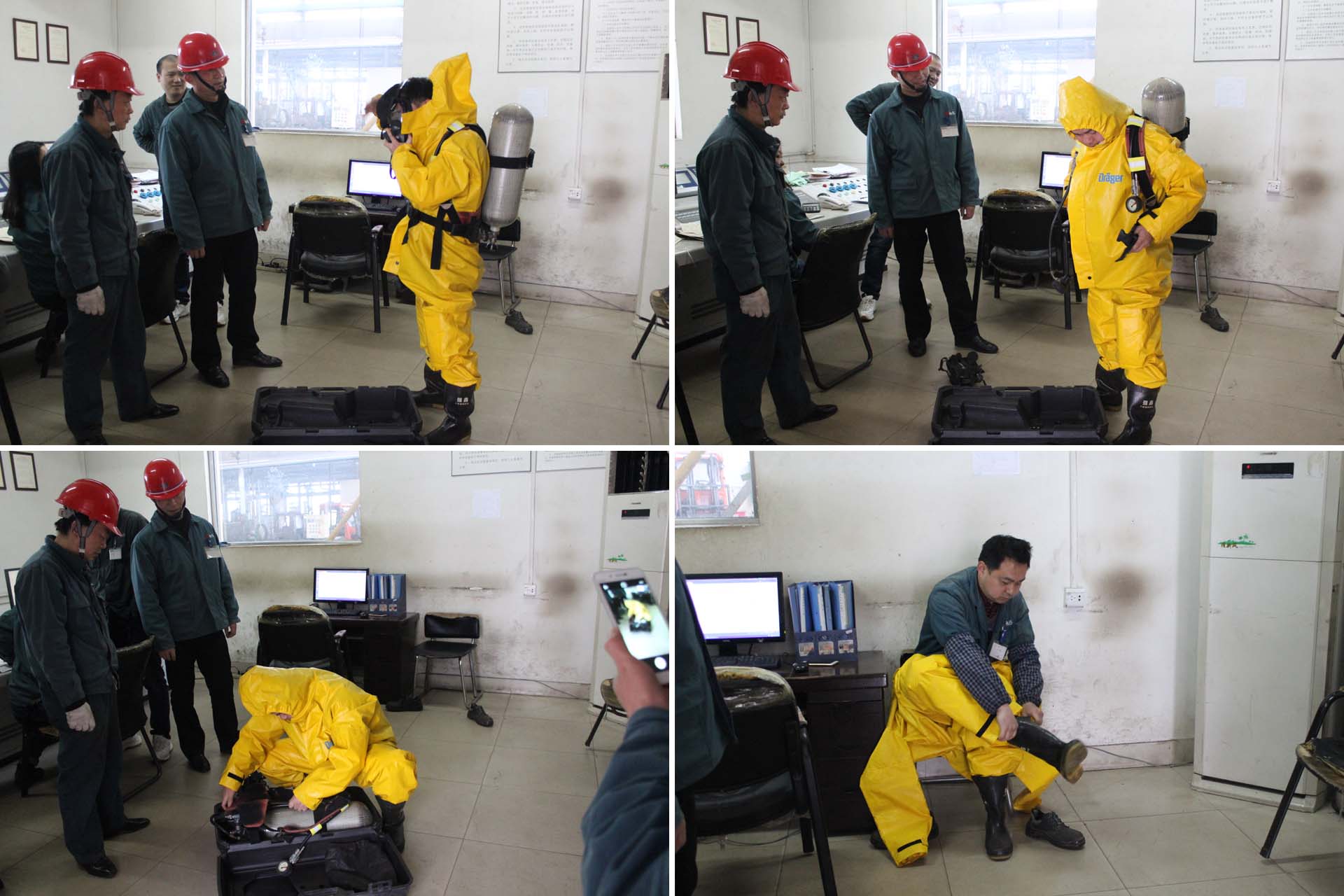 上午9:55分,液氯工段長楊子楓現(xiàn)場就演練內(nèi)容要點及注意事項進行了詳細的說明。10:01分演習正式開始:液氯包裝班長何克云發(fā)現(xiàn)液氯鋼瓶包裝現(xiàn)場聲光報警儀報警,立刻安排班組成員景斌、田更生戴好防毒面具,手持氨水在包裝現(xiàn)場查找漏點。10:05分發(fā)現(xiàn)漏點為包裝紫銅管發(fā)生泄漏后,隨迅速關閉灌裝瓶的充裝閥及瓶閥,打開抽空閥門將管內(nèi)液氯抽空,10點10分抽空后對其進行更換;隨后主操曾俊在操作室內(nèi)演練穿戴防化服及正壓式呼吸器。