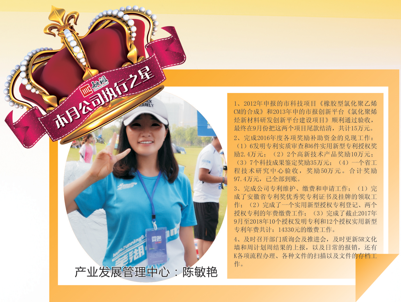 經(jīng)過激烈臺上PK,融匯化工2017年9月份公司級5R執(zhí)行之星由來自第二事業(yè)部的林康和產(chǎn)業(yè)發(fā)展管理中心的陳敏艷獲得。
