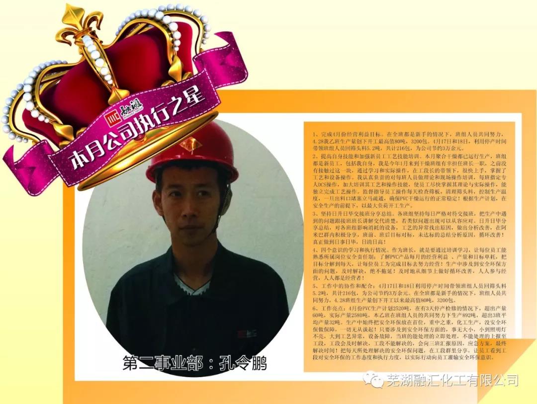 6、工作亮點(diǎn):4月份PVC生產(chǎn)計(jì)劃2520噸,在有3天停產(chǎn)檢修的情況下,超出產(chǎn)量60噸,實(shí)際產(chǎn)量2580噸,本乙班在班組人員的共同努力下生產(chǎn)892噸,超出3班平均產(chǎn)量32噸。生產(chǎn)中始終把安全環(huán)保放在首位,重中之重,化工生產(chǎn),沒(méi)安全環(huán)保做保障,一切無(wú)從談起!只要涉及到安全環(huán)保方面的,事無(wú)大小,小到照明燈不亮,大到工藝異常,設(shè)備故障,當(dāng)班的能處理的立即處理,不能處理的上報(bào)至工段,工段會(huì)及時(shí)解決,工段不能解決的,會(huì)向三班匯報(bào)原因,應(yīng)急方案,最終解決時(shí)間!把每天所處理解決的安全環(huán)保問(wèn)題,在工段群里分享,讓員工看到工段對(duì)安全環(huán)保的工作態(tài)度和執(zhí)行力度,以實(shí)際行動(dòng)向員工灌輸安全環(huán)保意識(shí)。