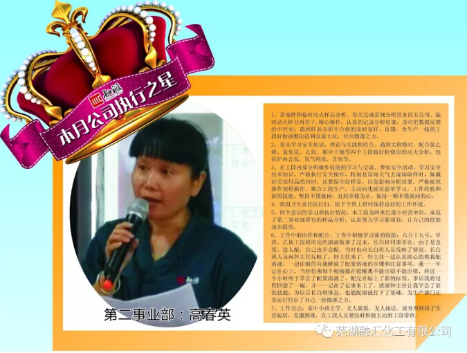 4、分享工作亮點(diǎn):1)完成生產(chǎn)任務(wù),安全為主,優(yōu)質(zhì)優(yōu)產(chǎn)。隨著氣溫升高,密切關(guān)注乙炔氯化各個(gè)關(guān)鍵參數(shù)點(diǎn),嚴(yán)格控制工藝指標(biāo)。2)六月生產(chǎn)任務(wù)較重,負(fù)荷較大,合成工段未雨綢繆,提前對(duì)問(wèn)題塔進(jìn)行調(diào)整,我?guī)ьI(lǐng)班組對(duì)多臺(tái)塔氣密查漏,配合保全更換噴射泵,開(kāi)車(chē)前補(bǔ)加催化劑,為高負(fù)荷生產(chǎn)提供了保障。3)轉(zhuǎn)訓(xùn)崗位職責(zé),安全責(zé)任制和四個(gè)意識(shí)。宣傳公司安全主題:生命至上,安全生產(chǎn);分廠安全主題:全面排查,重點(diǎn)落實(shí),安全發(fā)展。深入到班組每一位員工的心中,做到牢記于心,安全第一。4)6月21日,參加公司安全生產(chǎn)主題知識(shí)競(jìng)賽,并獲的第一名。5)6月26日,參加三烯安全消防演練,提升日常應(yīng)對(duì)突發(fā)狀況的應(yīng)對(duì)能力。