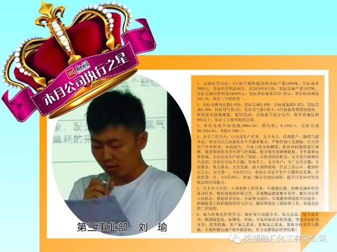 劉瑜在氯化合成工作中,閱歷豐富,善于預(yù)判趨勢(shì),洞察發(fā)現(xiàn)問(wèn)題,防范于未然!擔(dān)當(dāng)領(lǐng)頭羊的角色。
