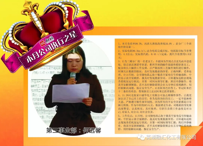5、四個(gè)意識(shí)的學(xué)習(xí)和執(zhí)行情況:安全環(huán)保方面:嚴(yán)格監(jiān)控各項(xiàng)指標(biāo),確保系統(tǒng)指標(biāo)在正常范圍內(nèi)運(yùn)行,安全穩(wěn)定生產(chǎn),我們班無(wú)安全環(huán)保事故發(fā)生;團(tuán)隊(duì)協(xié)作方面:面對(duì)指標(biāo)異常 情況,經(jīng)班長(zhǎng)DCS判斷后,制定相應(yīng)措施,及時(shí)解決問(wèn)題,確保高效穩(wěn)定生產(chǎn),在所有人共同的努力下我們班奪得第一名的好成績(jī);責(zé)任意識(shí)方面:巡檢是監(jiān)控現(xiàn)場(chǎng)生產(chǎn)安全運(yùn)行的 重要崗位,我們以安全高效生產(chǎn)為己任,產(chǎn)量是我們每個(gè)人的目標(biāo),單耗降低是我們每個(gè)人的追求,每天總結(jié)生產(chǎn)情況,不斷改善,保障了生產(chǎn)的穩(wěn)定高效;經(jīng)營(yíng)意識(shí)方面:我們 在保證安全高效生產(chǎn)的情況下,不斷采取節(jié)能降耗的措施,優(yōu)化操作手法,創(chuàng)造優(yōu)異業(yè)績(jī),爭(zhēng)奪優(yōu)秀班組榮譽(yù)。