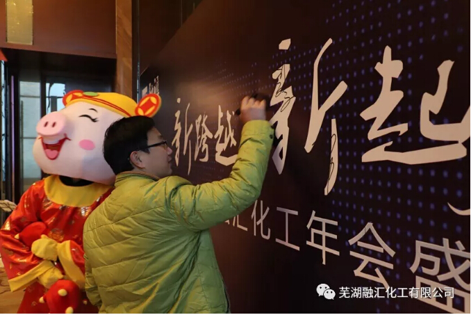 下午14時(shí)許,與會(huì)賓客在吉祥福豬的歡迎儀式上到達(dá)年會(huì)現(xiàn)場,并在簽名墻前簽名、留影。集團(tuán)董事長黃祖仕,融匯化工董事長黃丹青、總經(jīng)理張兵,集團(tuán)領(lǐng)導(dǎo)和融匯化工董事會(huì)成員出席了此次年會(huì)。