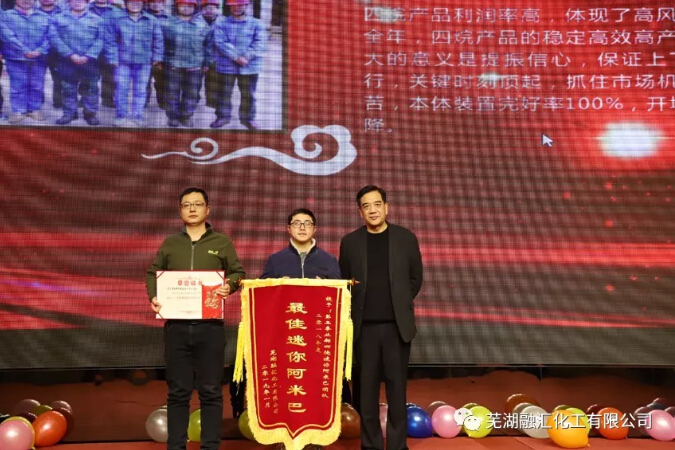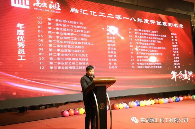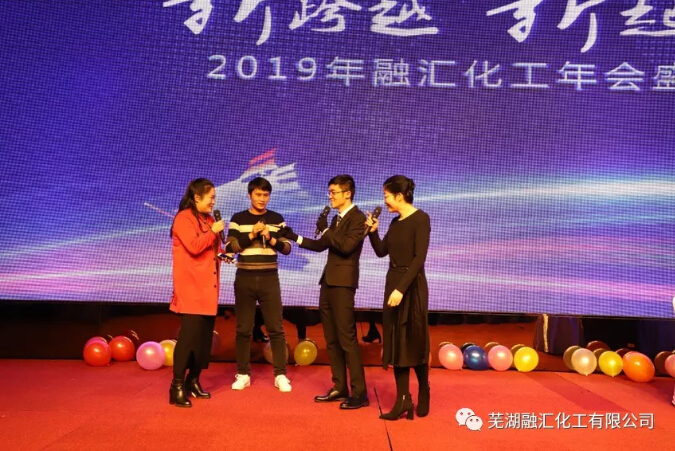 15點(diǎn),年會(huì)盛典在歡快激揚(yáng)的大片開場曲中正式拉開帷幕。首先,公司張兵總經(jīng)理作2019年施政報(bào)告,為我們?cè)谛乱荒甑墓ぷ髦该髁朔较颉kS后公司黃丹青董事長作了《改變自己,共創(chuàng)2019》的主題演講,演講從宏觀大環(huán)境的分析開始,再到公司2018年經(jīng)營環(huán)境的微觀分析,對(duì)公司全員在特殊大環(huán)境下取得的成績表示肯定,最后用“三個(gè)堅(jiān)信、三個(gè)力量和三個(gè)要求”為公司2019年工作奠定了基調(diào)。然后,集團(tuán)管理顧問李哲賢博士上臺(tái)發(fā)言,為公司2019年所取得的成績表示祝賀。緊接著,來自集團(tuán)黃祖仕董事長的一封信呈現(xiàn)在大屏幕上,字字情真意切,董事長上臺(tái)致新年賀辭,感謝和祝愿的話語勾勒出一幅溫馨動(dòng)人的畫面,我們懷著激動(dòng)的心情在此慶祝過去一年所取得的業(yè)績,同時(shí)我們也堅(jiān)信,融匯化工在2019年將取得更大的突破。最后,公司人力資源部何葉總監(jiān)宣讀了2018年公司優(yōu)秀個(gè)人和集體的表彰決定。