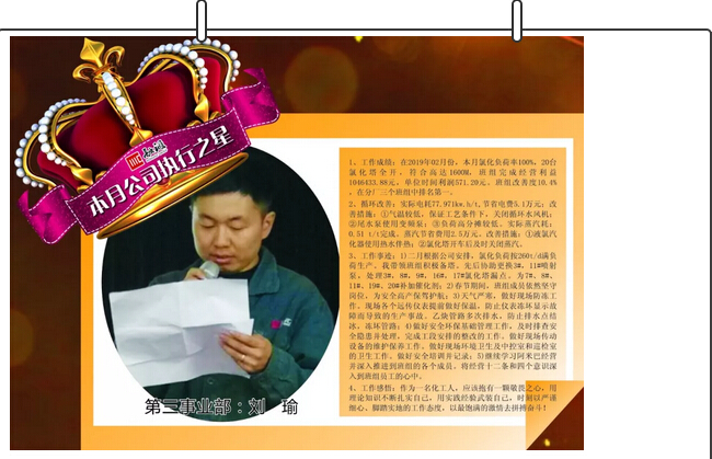 劉瑜年輕積極熱情,技能扎實(shí),關(guān)鍵時(shí)刻能夠頂上去。第一時(shí)間發(fā)現(xiàn)解決問題。保證了春節(jié)期間高負(fù)荷生產(chǎn),圓滿完成耗氯重任!