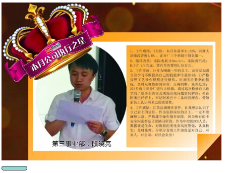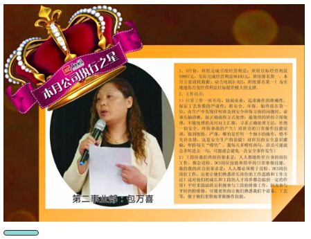作為一名三班班長(zhǎng), 她用自己的行動(dòng)感染著他人,發(fā)揚(yáng)“不怕苦、不怕累”的精神,帶領(lǐng)班組成員積極參與阿米巴經(jīng)營(yíng),努力實(shí)現(xiàn)經(jīng)營(yíng)目標(biāo),真是巾幗不讓須眉!