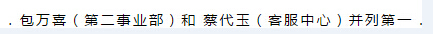 經(jīng)過緊張激烈的角逐,根據(jù)領導評委們現(xiàn)場打分決出了前六名:包萬喜(第二事業(yè)部)和 蔡代玉(客服中心)并列第一,第二名曹貴蓮(第二事業(yè)部),第三名王臘桂(安全環(huán)保部),第四名馬愛榮(第二事業(yè)部),第五名高春英(第二事業(yè)部),第六名鄭皖君(第二事業(yè)部)。